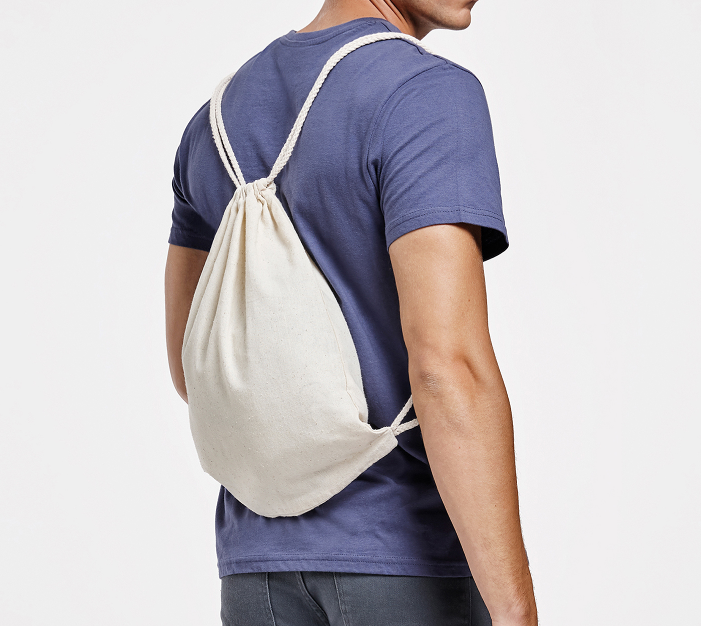 Λεπτομέρειες: Βαμβακερή τσάντα 100% 140 g/m² με κορδόνια πάχους 8 mm. Αφαιρούμενες ετικέτες. Διάσταση: 42cm/34cm